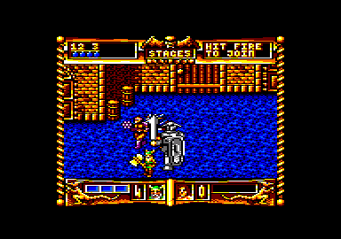 La nuit, des lutins-voleurs viendront troubler le repos de vos héros. En les frappant, vous récupérerez alors les précieuses fioles magiques. Ne ragez pas trop vite si vous ne parvenez pas à ajuster correctement vos coups. Il faut, en fait, placer votre personnage sur la même ligne horizontale que ces chenapans, pour les atteindre avec précision. Et pour corser l'affaire, le temps est limité. CREEZ Le grand intérêt de cette adaptation est la possibilité de jouer à deux. L'espérance de vie s'en trouve rallon-gée puisque le nombre des ennemis à se répartir reste le même. Mais, bien sûr, il n'y a pas plus de potion ni plus de barres d'énergie. En début de jeu. vous disposez de trois crédits. Vous pourrez donc continuez deux fois votre partie si vous jouez en solitaire ; et seul un joueur aura la possibilité de le faire dans le cas d'une partie en duo avec votre meilleur ami.