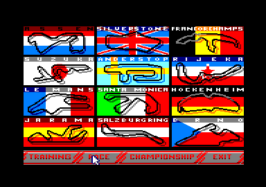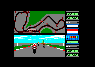 La principale raison qui avait octroyé à GP 500 un certain succès, et pour ceux qui ne s'en souviendraient plus, je le rappelle, c'est la possibilité de jouer à deux. Possibilité heureusement conservée dans cette seconde version. En effet, le fun est ainsi multiplié, au moins par deux. Même chose pour la note, multipliée aussi (mais peut-être pas par deux quand même). Bref, l'option deux joueurs est la plus importante du jeu. DANS LES STANDS Que nous comparerons (les stands) aux options que nous propose le jeu. Le premier écran vous propose donc de jouer soit au clavier, soit au joystick et de piloter seul ou avec quelqu'un, ce qui reste toujours très important (meuh non, j'insiste pas). Vous pouvez également inscrire votre nom et recharger une sauvegarde au cas où vous vous seriez avancé dans le Championnat. Le second écran vous invite, lui, à faire votre choix entre quatre motos de couleurs différentes. Les caractéristiques de chaque bécane sont également censées être différentes mais la version que nous possédons n'étant pas définitive je n'ai pas pu vraiment m'en rendre compte. Tout cela n'ayant pas grande importance, hâtons-nous de passer au troisième menu qui vous demande de sélectionner un des 12 circuits du Championnat afin de vous entraîner, de participer à une course ou de courir pour le Championnat. Voilà, vous savez tout. Voyons maintenant ce que nous propose la course proprement dite.