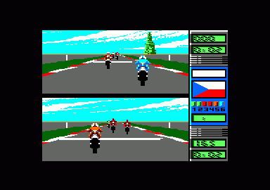 Quatre motos sont disponibles, le changement ne venant que de la couleur de l'habillage, et c'est la qualification, puis, la course où votre position de départ dépendra du résultat précédent. Deux fenêtres s'affichent l'une au dessus de "autre, les motos sont en place, et à droite de l'écran se trouvent les indications classiques comme le temps, la vitesse et les positions des coureurs. Le feu vert est donné, et les moteurs se mettent à rugir. Vous voyez votre moto dans la fenêtre du bas, celle du haut étant occupée soit par un tracé du circuit avec l'évolution des motards, soit la moto du second joueur humain, ou le suivi de n'importe quel coureur que vous sélectionnez à l'aide du clavier. Voilà une bien belle simulation sportive. Tout d'abord les graphismes sont très réussis. Les rouleurs vraiment bien choisies, les décors fin et clairs, et les animations des motos assez réalistes. Pour ce qui est du scrolling de la route, c'est tout bonnement magnifique. Ça va extrêmement vite, même que c'en est une performance. La moto répond parfaitement aux injonctions crispées du joueur, sachant qu'il est possible de piloter au clavier ou au joystick.