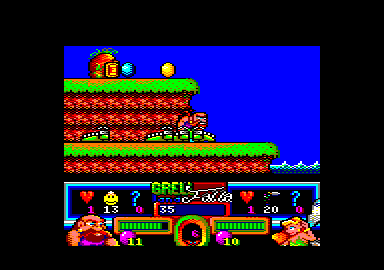 Labelled as the first ever Garden-'em-up Grell and Falla puts you in the position of Gardeners to the Sorcerer. All you must do is beautify his garden and remove the evil curse from all the creatures inhabiting it. Simple. Well it would be if these creatures didn't eat your newly planted flowers and drain your energy! Though luckily both Grell (The dwarf) and Falla (The fairy) are equipped with magic spells to remove the curses from these creatures and turn them back into the cute fluffy animals they once were. A range of spells are available to help yog do this which can be bought from the shop on each level. As well as spells, flowers and plants must also be bought from here. These are paid for with magic pebbles, which can be collected when you remove the curse from a creature or complete a level. The amount of pebbles Grell & Falla collects at the end of each level is proportional to how much you have improved the garden and how quickly you did it. Whilst playing the game you can swap between the two main characters at any time. Each have different attributes. Grell, aged 397. is the stronger and is the only one who can buy and plant flowers whereas Falla has the ability to fly and move much faster - very useful when searching for that last frog or gnome. Each has only one life but has an energy bar which is drained when you touch a cursed creature or water, though a swim spell can be bought to avoid this. Once all your energy has gone the character will lie on the ground for thirty seconds before dying, in which time the surviving character can cast the kiss of life spell and revitalize him or her. Graphically this game is colourful, though a bit blocky, with large well animated sprites which don't slow down much with many on screen at once. Another success for Codemasters and with 50 different levels should keep anyone happy for a while. CPC Attack