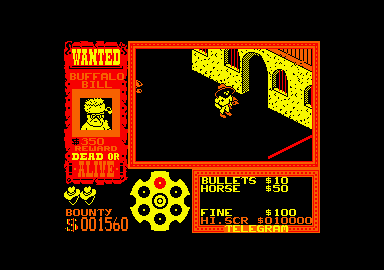 When Ultimate brought out Alien 8 many people cried rip-off because of its similarity to Knight Lore. Now they are set to face the same problem with this wild west romp, as it looks like Nightshade - and this time the game doesn't come out smelling of roses. The game is set in a wild west town where you, as the Sheriff, have to hunt down and kill outlaws for the bounty. The town is shown in the same 3D perspective as Nightshade and Knight Lore, with building fronts disappearing as the Sheriff walks behind them, so that you can see where you're going. Buildings can be entered through open doors, but there's nothing of interest inside unless one of the other game characters is already in there. The town is populated by an extremely annoying and stupid group of people who seem intent on stopping the Sheriff doing his job. There are lots of women who wander aimlessly around and, when they bump into you, kill you. This doesn't seem like civilized behaviour to me, but is as nothing to the fact that bumping into small children and cacti also knocks off a life. You can of course shoot these innocent bystanders down when they get in your way but you'll be fined for it, reducing your bounty. The outlaws appear one at a time and before you can get into a gunfight you'll have to find them. This can be done by just wandering around the town, but the children will help guide you to them they bounce up and down on the spot pointing in the direction of the target, turning to face him if he moves around. Once you've located the bad guy you need to shoot him once to get onto the gunfight screen. Here the man appears in 2D on the screen, and as soon as he draws his gun you have to move a cursor onto him and let him have it, otherwise he'll riddle you with bullets. Draw too early and you'll be branded a cheat, ending up with yet more holes in you. help you get are from horses which can be 'ridden' if you want to move faster. They don't last for very long, but while they do you can trample women and children under foot - most gratifying. Bullets and horses both cost money though so you won't want to use too many of either. At the start of the game and after every few outlaws there is a bonus screen where you can practice shooting bags of gold. This should prepare you for the fight screens and helps the bank balance. Another thing that appears if you shoot enough men are balls of tumble weed that blow around the screen, making your progress more dangerous. The graphics and action are fax too close to Nightshade for comfort, and although the game is more interesting than its predecessor it loses a lot because of its lack of originality. If you've got Nightshade this probably isn't worth getting but if you're fresh to Ultimate's games then it should impress. The action is quite compulsive and the game has a good sense of humour, but those women-folk are tremendously annoying as they behave more like outlaws in drag than law abiding citizens -1 say waste 'em with a hail of leaden death. BW, AA