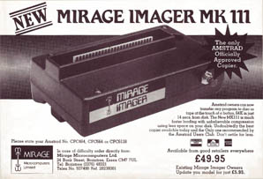 Voici une petite boîte noire d'aspect anodin, si ce n'était cet intrigant bouton rouge qui la surmonte, et sur lequel on ne demande qu'a appuyer, pour voir ... La connexion de Mirage Imager sur le port d'extension des CPC ne pose aucun problème. Un prolongateur de bus de quelques centimètres est livré avec la version CPC 6128, pour cause de non similitude des emplacements de connecteur. A la mise en route: rien! Contrairement aux apparences, c'est bon signe. Je charge donc mon jeu d'arcade favori, acheté la veille. Il fonctionne à merveille, et me laisse atteindre en deux coups de cuillère à pot (c'est la forme naturelle de mon joystick) le quarante troisième tableau. Comme il est peu probable que je puisse renouveler cet exploit à la prochaine occasion, j'appuie d'un index subreptice et décidé sur le petit bouton rouge. Encore quelques pressions sur le clavier, et voilà rangée bien au frais, sur disquette, toute la mémoire de l'ordinateur, y compris le jeu et ma position dans celui-ci, prêts pour un prochain usage, et un futur record.