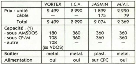 (1) La capacité est donnée en Ko par face sauf dans le cas du F1-X de VORTEX sous CP/M et VDOS qui gère les 2 faces de la disquette. Dans ce cas, c'est la capacité totale de la disquette qui a été indiquée. H. Wone , AMSTRAD MAGAZINE n°14 & https://cpcrulez.fr