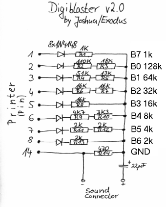 The original Text was written by A.Stroiczek and the DMV-Verlag (CPC International 8/9'91), the hardwarelayout of the Digiblaster v2.0 was performed by Joshua/Exodus and converted by Tim Riemann (TCS-Software@gmx.de). Please mail me if there are any mistakes (especially my bad english ;-) ! If we're looking at the 16bit computers like Amiga, Atari ST, Mac and PC (with a soundcard) the CPC users can be jealous. We can help with an easy circuit plan. The CPC only can do rectangle frequencies. Amiga and other computers are working with digital instruments which they give out with internal D/A converters. If you look exactly the CPC has the possibility to give out digital instruments. For this you need the volume register. This register can handle 16 different volumes. So it may be possible to play samples with 4bit. But the soundchip dissapoints again. To play a linear volumeincrease the power at the sound port is logarithmical. This means that you have to change the values so that they are linear. So you only have 3bit. The Amiga has a advantage with his 8bit samples. If you say: "Okay, half bits are enough" you are wrong. With 3 bits you can use 8 different values, with 8 bits 256. That means you cannot play low sounds. Okay, if you don't look at the very difficult programming the CPC is not as good as his colleagues. But the meagre printer port allows you to change that. The printer port makes it possible To build a D/A unit you normally need a special IC which costs about 15 to 20 DM and it needs an own power supply. The circuit here costs about 3 to 12 DM and does not need an own power supply. But because of this the output power is not exactly linear.You can connect the output of the circuit directly to an amplifier. All good things are three Of course, the D/A unit needs a small demo program. Because sampled instruments are very long I only have printed the file 'DATA1.BAS'. Start it and hear a little sound. Strangly it sounds much better when the upper ROM is selected. The programming The program writes directly to the hardware of the CPC. You can use the port with the adress &EFxx. Because the CPC has only a 7bit printer port (we need 8bit for the Digiblaster) we use the STROBE signal, which is inverted by the hardware, so you have to invert your sound value. Now we want to output the value &C5: LD a,&C5 ;A=&C5PIN 2 ; D0 PIN 3 ; D1 PIN 4 ; D2 PIN 5 ; D3 PIN 6 ; D4 PIN 7 ; D5 PIN 8 ; D6 PIN 9 ; GND PIN 11 ;BUSY PIN 14 ;GND PIN 16 to PIN 28 GND PIN 33 ;GND |