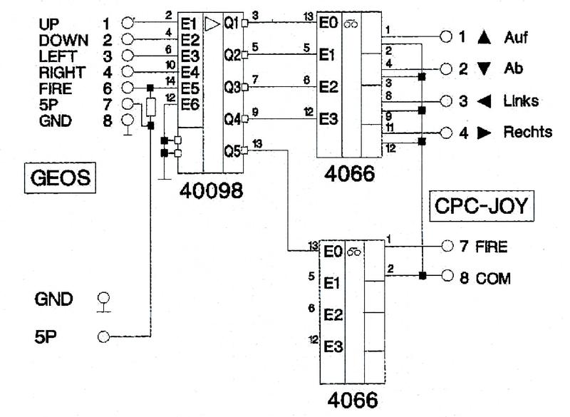 Ein Nagetier für den CPC Es gibt sie schon, die Maus für den CPC — sie ist aber nicht gerade preiswert. Eine Alternative, die wenig kostet und etwas technisches Geschick sowie elektronisches Wissen erfordert und zudem vollständig Joystick-kompatibel ist, möchten wir Ihnen hier vorstellen. Die hier vorzustellende Maus-Lösung für die CPCs benötigt lediglich drei CMOS-ICs (einen 40098, zwei 4066 oder 4016), einen 9poligen SUB-D-Stecker und eine 9polige SUB-D-Buchse. Bei der Maus handelt es sich um die GEOS-Mouse vom C64-Hersteller Commodore, die etwa 40,— DM kostet und in den meisten Warenhäusern erhältlich ist. Eingriffe in die Hardware des CPC - gilt im übrigen für alle Modelle — sind ebensowenig notwendig wie zusätzliche Software. Preiswerte Lösung Die GEOS-Mouse hat folgende Anschlußbelegung: