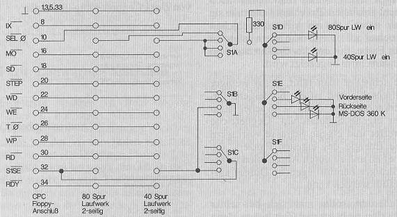 Zur Verbindung mit dem Floppybus sind insgesamt 13 Leitungen nötig. Die Verdrahtung des Verbindungskabels ist aus der Zeichnung ersichtlich. Die Leitungsführung geht vom CPC zum 80-Spur-Laufwerk und weiter zum 40-Spur-Laufwerk. Eine Ausnahme bilden die Anschlüsse 10 (/SELECT0) und 32 (/SIDE SELECT), diese werden extra geschaltet. Hiermit wird vermieden, daß zwei Laufwerke gleichzeitig aktiv sind. Der momentan eingestellte Zustand wird über LEDs angezeigt.| PIN | Bezeichnung | Bemerkungen | | 1, 3 ,5 ... | Masse | mit CPC Masse (0V) verbincen | | 2 | | | | 4 | | | | 6 | | | | 8 | /IDX | Indeximpuls (1 Impuls je Umdrehung) | | 10 | /SELECT0 | Laufwerksauswwahl | | 12 | | | | 14 | | | | 16 | /MOTOR ON | schaltet den Diskettenmotorein | | 18 | /STEPDIR | Schrittrichtung des Kopfmotors | | 20 | /STEP | Schrittimpuls für Kopfmotor | | 22 | /WRITE | Schreiben von Daten | | 24 | /WRITEEN | Schreibfreigabe Daten gültig | | 26 | /TO | Nullte Spur erreicht | | 28 | /WRITEPROT | Schreibschutz der Diskette ist gesetzt | | 30 | /READ | Lesen von Daten | | 32 | /SIDESEL | Seitenauswahl Vorder- oder Rückseite | | 34 | /READY | Fertigsignal der Floppy |
