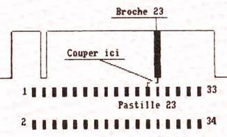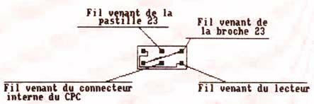 PRETS, PARTEZ ! A ce moment, vous pouvez voir. en haut à droite de la carte, sous le connecteur du drive N, l'inscription B FDD DRIVER C'est sur ce connecteur que nous allons faire toutes nos opérations. Faites attention à ne pas faire le travail sur la prise parallèle, lorsque la carte sera retournée, sans quoi: papoum ! Retournez la carte, et coupez la piste qui relie la pastille 23 à la broche 23. La pastille numéro 1 est indiquée par le chiffre 1 à son côté, et la 23 est simplement la douzième pastille en partant de la 1. Cette pastille est la plus proche du connecteur et c'est la douzième en partant du bout du connecteur, c'est-à-dire du côté gauche de la carte lorsqu'elle est à l'envers. fi faut ensuite souder un fil. la carte étant toujours à l'envers, sur la broche 23, en faisant attention à laisser de la place pour un éventuel connecteur femelle. Vous pouvez alors revisser la carte sur le châssis. Soudez un fil sur la pastille numéro 23. Par ces opérations, le signal d'appel du lecteur B est neutralisé il faut maintenant détourner celui du lecteur A Pour ce faire, il faut simplement couper le quatrième fil du câble nappe, qui part du connecteur interne de la carte vers le lecteur 3 pouces interne; c'est-à-dire celui qui est juste avant le m vert, en partant du côté du fil rouge. Rallonger les deux bouts des ms ainsi obtenus avec deux petits morceaux de fil et les isoler avec du chatterton pour éviter les courts-circuits. Quatre fils sont donc disponibles, un venant du lecteur 3 pouces, un du connecteur interne de la carte, un de la pastille 23 et un de la broche 23. Il faut souder le fil venant de la pastille 23 sur rune des broches du centre de l'inverseur. à son côté, souder le m venant de la broche 23. Le fil venant du connecteur interne doit être soudé sur l'autre broche du centre de l'inverseur, et le fil allant au lecteur interne 3 pouces doit être soudé en face du fil venant de la broche 23. Relier ensuite les diagonales de l'inverseur avec deux petits fils, et le tour est joué. Il ne vous reste plus qu'à remonter le CPC en laissant l'inverseur à l'extérieur du boitier. Les bricoleurs peuvent découper leur CPC pour fixer l'inverseur de manière à ce qu'il ne soit pas volant. Grâce, à cette intervention, il est possible de sélectionner le lecteur qui sera le drive A. Dans la première position, tout se passera comme à l'habitude, et, dans l'autre cas les signaux destinés au lecteur B iront au A et l'inverse se produira aussi. Vous avez des petits schémas pour vous aider à mieux comprendre ces confuses mais si simples explications. Alors, à vos fers à souder et prudence, car la garantie ne sera plus en vigueur après ce genre de modification. Comme ce montage est hardware. tous les softs ne peuvent que fonctionner normalement, si la copie de sécurité est de bonne qualité, bien entendu. Carte vue de dos : ( prise drive B )
