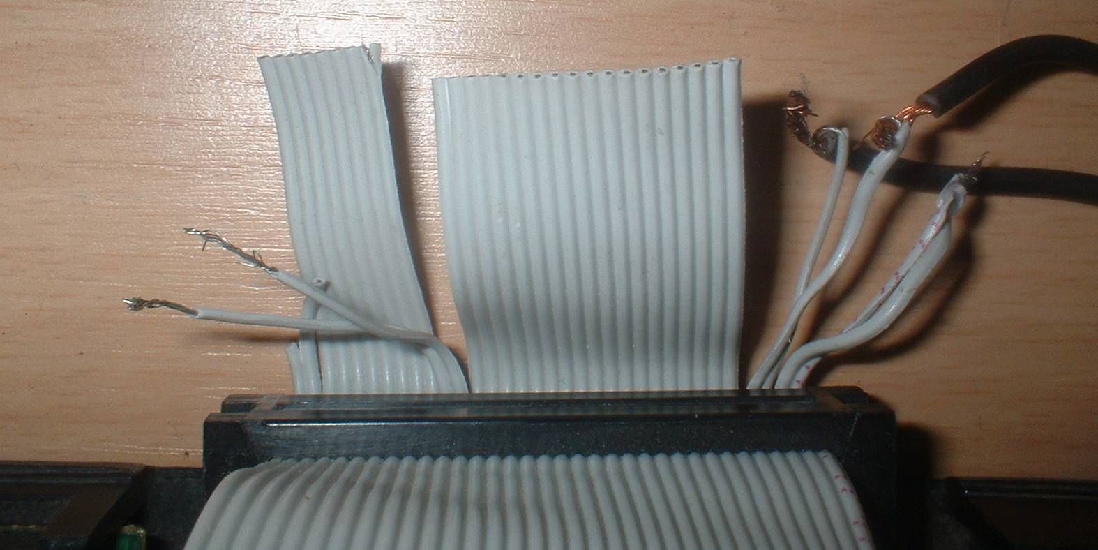 Création d'un cable pour connecter un lecteur 3"½ sur le "port drive" d'un CPC 6128: nécessite un lecteur 3" ½ ( de PC/Amiga/ST ... ? ) et un ancien cable lecteur de disquette pour PC ( avec au moins une connecteur 5"¼ et autre 3" ½ ). Fils 11 et 12 est le "Drive A/B Select" ( mettre un interrupteur ) sur la gauche de la photo. Fils 32 et 31 est le "Side Select" selecteur de face ( mettre un interrupteur ) Fils 34 et 33 est le signal Ready, toujours brancher !!