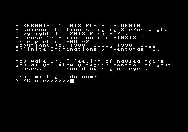 Hibernated 1 - This Place is Death (Director's Cut) is an Infocom style interactive fiction game. It's a complete rewrite of the classic, award-winning Hibernated game using Infocom's Z-machine standard, with tons of additional narrative content and riddles. If Infocom had been asked to recreate the classic Hibernated, the Director's Cut would have been the outcome.