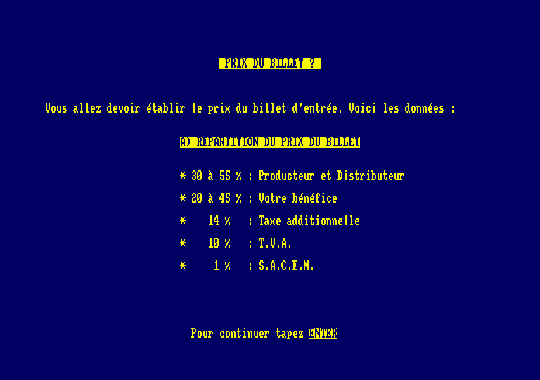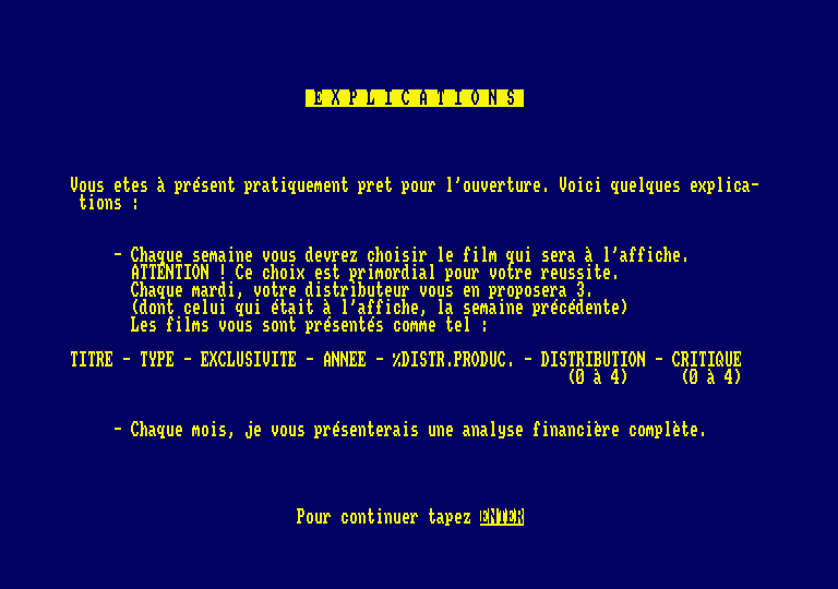 Jeu de simulation économique. Il faut ouvrir une salle de cinema, mais il y a de la concurrence. Ensuite, il faut choisir le nombre de séances, la programmation des films, leur genre, etc.. Un bilan annuel est dressé... |