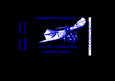 Si vous parvenez à l'ouverture du tuyau au moment où il ne souffle pas, vous tombez dedans et tout ce parcours est à recommencer ! Ailleurs, des interrupteurs commandent l'ouverture de certains passages ou l'arrêt de pièges. Si vous les activez à proximité ou selon la mauvaise séquence, rien de bon n'est à envisager. Pour compliquer le tout, chaque étape doit être terminée en temps limité. La réalisation est excellente. Si les sprites sont un peu petits (conséquence quasi obligatoire des jeux de plates-formes), en revanche les décors sont très travaillés avec un grand luxe de détails. La mise en couleur est tout aussi réussie, le programme semblant d'ailleurs recourir à une astuce soft pour outrepasser la limite des 4 couleurs du mode 1. Hudson Hawk est un jeu prenant, qui donne envie d'aller toujours plus loin pour découvrir les énigmes complexes imaginées par les programmeurs.