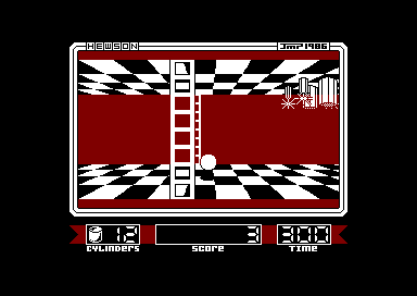 Foin des scénarios tirés par les cheveux : impossaball est une sphère rebondissant, dans un couloir, au sol et au plafond tapissés de damiers. Il faut toucher le sommet des colonnes stalactites (qui tombent) et stalagmites (qui montent) en évitant les épines, les champs de plasma et les éclairs. Tout est dit. Il y a neuf niveaux de difficulté. Ce jeu tient de Spindizzy et de Traiblazer. C'est bien dessiné et agréable à regarder. Tout est clair : les règles, l'image, nette et lisible sans efforts, les couleurs franches de salle de bain ou de chambre d'enfant. Mais encore?.Sachez que l'ombre de la balle, tombant à la verticale, aide grandement les repérages. Appuyer sur le bouton «feu» augmente la force des rebonds jusqu"à frôler le plafond. Mais les colonnes à ratatiner poussent préférentiellement près des objets mortels. Le son se réduit aux bruits des rebonds. Toute l'attention des programmeurs s'est portée sur le réalisme des rebonds et la précision des colhisions que leur effet soit bénéfique ou mortel. Au départ vous disposez de temps de quatre vies et chaque 5 000 points offrent une vie supplémentaire. Bien au point : le programme met la précision de vos gestes a l'épreuve . Attention on y prend goût TILT n°41 Avril 87 |