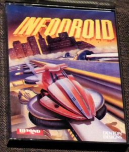 Let me take you to the streets of London la la la .. . Where every alleyway and throughfare is rendered a shooting gallery by the dreaded bikers. Now imagine the situation in the City of the Future, where droids (robots really) traverse the 15 Great Causeways, delivering packages between the trading companies. Imagine Infodroid, courtesy of Beyond (RIP?). Unlike the leatherclad youth on a Yamaha, most of the droids (like yours) are well behaved. They pop into a trader, pick up a parcel and drop it off at the appropriate recipient. The idea is to get as much money as possible (some things never change) by using the shortest route and carrying as much as possible at once. The causeways are arranged as seven parallel bands. The middle band has lifts on it to the traders, service areas and junction points to other causeways. It is stationary. Sounds too easy? Well, there are gangs of rogue droids whose operators make their money by attacking and robbing peaceful, law abiding 'bots such as your good, metallic self. And they play dirty. To help you there are various bits of hi-tech anti-piratical goodies available from your local Droiderama Service Station. These cost money, but you'll need 'em. Likewise, you'll need regular servicing and energy replenishment. Control of your droid is by joystick alone. On the causeway, you hop about in any direction. When you're on the central band, and on a lift, a sharp pull downwards with the fire button pressed moves you into whatever bit you're over. Battling the brigands is simple - don't. You cannot buy or acquire any sort of arms or zapper so you must turn and try to outrun anything that has a go at you. See why shields and boosters are such a good idea? If you lose a droid, you have (initially) enough credit to buy a new one. If you're good, you can keep enough credit to hand to keep solvent even after a disaster. All your gadgets can be damaged; there's a status display to keep you informed of their current serviceability. But that won't happen to you, will it? ACU #8703