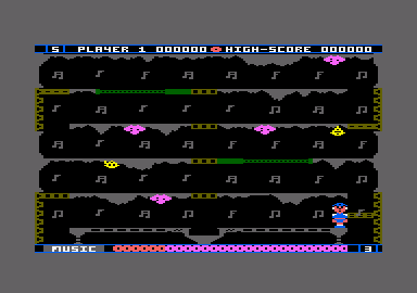 Jet Boot Jack is quite a novel idea for a game, although it is probably what most people would call a platform and ladders type of game. Your multi-coloured character consists of a reasonably large sprite, an amiable little chap. His purpose in life is to fly around collecting musical notes, each scoring him points and giving a melodious ping into the bargain. Projecting rocks in the roof can prove fatal, but may be avoided by instructing Jack to lower his head - pressing the fire button as each is approached. Transport between levels is accomplished by one of several lifts on each screen, care must be taken not to enter one as it is moving, this is also fatal. Some of the platforms consist of 'conveyor belts'and may drag Jack towards one of the rocky bits of celling - care is therefore necessary to dip his head at just the right moment. Another type of aid to movement is the horizontally moving platform that may only be embarked upon when it is at rest. This then moves Jack across to another stationary piece of platform. There is no time limit, however, fuel is used by Jacks Jet Boots, this may be replenished by picking up one of the fuel pods that hang from the ceiling. It is unwise to collect too much though, because those remaining will count towards the bonus upon completing a particular screen. With practice, it is possible to move quickly around the screens, which produces a very simple tune as each note collected produces its sound. Five lives are available, but on losing the last, you then have the opportunity of starting on any of the screens that you had completed up to that point. The above describes the game in its practice mode - when you think you have gained sufficient control, the game can then be played with all sorts of nasties dangling from the ceiling. This game proved to be extremely addictive and the ability to pick starting screens once that screen has been completed means that you aren't always stuck with the very first screen. Although there are only 10 screens, each made of similar elements, each has a character of its own and the detail makes up for the lack of number. The figure that you control is not just another boring single colour UDG, but is multi-coloured and well detailed, making it a pleasure to drive him about. The control is pixel accurate and very responsive - all round a very enjoyable game and well worth considering. ACU #8506