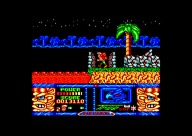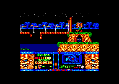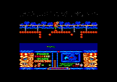 Pero la inmensa masa de vegetación no presenta ningún claro donde poder realizar un aterrizaje con un mínimo de garantías, y el piloto realiza una maniobra desesperada para enderezar el rumbo del aparato e intentar amortiguar los efectos de una terrible caída contra los árboles. Tras un tremendo estruendo el piloto pierde la vida aplastado entre los restos del morro del avión, pero con su valerosa maniobra consigue paliar los devastadores efectos del choque salvando así la vida de los dos pasajeros. Horas más tarde, el fragor del metal retorcido ha dejado paso únicamente a los misteriosos sonidos de la jungla. Keorg recupera lentamente la consciencia rodeado de los restos destrozados del aparato y , aún aturdido por los golpes recibidos, sus primeros pensamientos son para Susan. Temiendo lo peor explora rápidamente el interior del aparato localizando el cuerpo sin vida del piloto entre los restos de la cabina, pero sin encontrar rastro alguno de la doctora. Su desaparición le indica al menos que se encuentra con vida aunque, probablemente, en manos de seres desconocidos. Tras explorar los alrededores descubre varias huellas que le llevan a la conclusión de que, sin duda, Susan ha sido raptada por los Ougadú, una supersticiosa tribu que habita en esta zona de la selva que sin duda han raptado a Susan para sacrificarla a sus dioses. Con la firme convicción de que probablemente cada minuto que pasa es precioso, Keorg decide ponerse en marcha rápidamente para rescatar a la doctora antes de que sea demasiado tarde. Preliminares Reuniendo toda la información que encuentra entre sus cuadernos de notas, Keorg averigua una serie de interesantes datos sobre la vida y costumbres de los Ougadú. Descubre así que se trata de una tribu que rechaza todo contacto con el exterior, por lo cual la mayor parte de su territorio sólo es accesible, haciendo uso de unos amuletos que se encuentran en poder de los cuatro hechiceros de la tribu. La poderosa magia de los hechiceros, que custodian fuertemente dichos amuletos, sólo puede ser neutralizada atemorizándoles con los fragmentos de la piedra mágica de Azte-Alk, una antiquísima piedra que representa un grabado del dios Pájaro y que hace siglos fue dividida en cuatro trozos, los cuales fueron escondidos en el interior de otras tantas cúpulas sagradas. Por tanto el objetivo de Keorg es encontrar el primero de los fragmentos de la piedra para derrotar al primer hechicero y obtener el amuleto guardado por él, mediante el cual podrá penetrar en nuevas zonas del territorio sagrado de los Ougadú y continuar el proceso con los cuatro hechiceros. Solamente con la ayuda del cuarto y último amuleto podrá acceder a la zona en la que se encuentra prisionera Susan, atada a un poste levantado al borde de un precipicio. Unicamente haciendo uso de la magia de los amuletos podrá hacer desaparecer barreras mágicas que impiden a los intrusos adentrarse en el territorio sagrado. Del mismo modo existen una serie de zonas en apariencia inaccesibles a las que solamente será posible llegar haciendo uso de unos globos de hidrógeno que sólo harán su aparición si Keorg se encuentra en posesión del amuleto correspondiente. Para cumplir con su difícil cometido Keorg dispone únicamente de tres vidas y un marcador de energía que irá disminuyendo con el contacto de los animales que pueblan la selva y los ataques de los que guerreros Ougadú. Keorg perderá una vida al agotar su energía, pero también perderá una vida completa si cae a una trampa de cuchillos, un pozo de lava u otro de los muchos peligros que encontrará en su camino. Sin embargo, los ríos y lagos que ocupan gran parte del territorio Ougadú no suponen peligro para la integridad de Keorg pues nuestro héroe es capaz de nadar y bucear con destreza en dichos lugares, si bien deberá evitar todo contacto con las pirañas y anguilas eléctricas que pueblan tan húmedos parajes. Para defenderse de los ataques Keorg dispone de una pistola con número limitado de balas que solamente podrán emplear cuando se encuentre sobre el suelo, nunca saltando o nadando. En lugares concretos del mapeado Keorg podrá localizar y recoger (pulsando la tecla destinada a tal efecto) una serie de objetos que le permitirán poner de nuevo al máximo tanto el nivel de energía como de municiones. Menos frecuentes son unos objetos que, al ser recogidos, proporcionan inmunidad momentánea a Keorg mientras la barra de energía se encuentre en estado parpadeante. La estructura del mapeado no es siempre lineal. En numerosas pantallas encontraremos unas puertas fácilmente reconocibles por dos pilares de piedra que las rodean. Si Keorg se coloca exactamente sobre la puerta y pulsa la tecla apropiada (abajo o arriba según la puerta sea de entrada o salida) podrá acceder a nuevas zonas del mapa sabiendo que, en todo momento, es posible realizar el proceso inverso para regresar a la zona inicial. Para facilitarnos la orientación entre la maraña de pantallas y puertas las hemos identificado mediante una letra que indica el lugar al que conduce cada puerta en concreto. Tanto los fragmentos de la piedra sagrada como los hechiceros se encuentran siempre en las mismas pantallas, lo que facilita su localización. En busca de Susan Con su macuto a la espalda y el dedo firme sobre el gatillo Keorg inicia su peligrosa aventura frente a la tienda de campaña que le ha servido momentáneamente de campamento. Solamente una pantalla hacia la izquierda se encuentra Susan atada a un poste al otro lado de un gran precipicio sobre el que es imposible saltar. Con la imagen de la desdichada joven golpeando incesantemente su mente, Keorg hace un esfuerzo de voluntad y se dirige en dirección contraria para sumergirse de lleno en la aventura que se abre ante él. Una pantalla hacia la derecha Keorg observa dos puertas y se introduce por la situada más a la derecha. Tras superar un gran río, bien nadando o bien haciendo uso del pu
