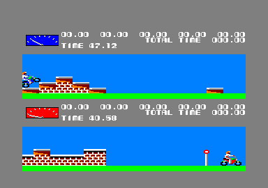 AU QUART DE TOUR Bon, puisque Budget n'était pas au casino, je me suis dit : "Peut-être est-il parti faire quelques tours de cicruit." Après tout, c'est vrai qu'il aime aussi beaucoup les motos, et plus particulièrement les motos de cross. A peine étais-je arrivé aux abords du terrain qu'un motard complètement bourré manqua de me renverser ! Ça n'allait pas se passer comme ça : j'enfourchai la première bécane que je vis, et partis illico à sa poursuite. Le circuit accidenté, les autres concurrents... tout ça ne comptait plus pour moi. La griserie de la vitesse m'avait même fait oublier pourquoi j'étais monté sur cette bécane d'enfer. Mon seul but était maintenant d'arriver le premier à la ligne d'arrivée... Faut dire que j'avais eu de la chance : ma moto répondait du tonnerre, et je sentais bien qu'elle avait quelques chevaux dans le ventre. Je remontais peu à peu le flot des concurrents, et soudain ! Qu'aperçus-je ? Juste en dessous de moi, dans la deuxième moitié de l'écran, un mec tentait de me dépasser. Serait-ce Budget ? Non, rien d'autre qu'un petit frimeur qui pensait pouvoir me coiffer au poteau. C'était mal connaître Super Carburant : un petit coup d'accélérateur bien placé dans la dernière ligne droite, et je franchissais la ligne d'arrivée avec plusieurs longueurs d'avance sur lui. Il voulait absolument prendre sa revanche, alors on a refait plusieurs tours ensemble, chacun choisissant son terrain à tour de rôle. C'était super, on a beaucoup ri. Mais malgré ça, toujours pas de Budget en vue.