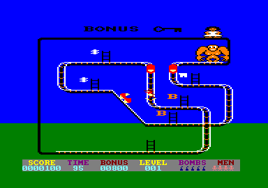 RHAAAAH ! QUE C'EST BON...Tout petit déjà vous jouiez dans les cafés à Donkey Kong, vous arriviez à faire tourner le compteur, sans les mains, tellement vous étiez habitué à ce jeu Pas de problème ' Le nouveau Kong est deux fois plus balèze : la musculation intensive lui a réussi puisqu'il se hisse (au fur et à mesure des tableaux) au sommet de magnifiques scenic railways (les montagnes russes cong !). Kong Strlkes Back : le défi nouveau d'Ocean est arrivé... Sur Commodore, Amstrad et (bientôt) Spectrum. A vous de grimper jusqu'en haut en évitant habilement les wagonnets que lance contre vous Kong grâce aux échelles subtilement disséminées sur votre parcours. Armé de votre seul courage (et de cinq bombes pour toute la partie) vous aurez à reconstituer des clés qui ouvriront non seulement la cage mais aussi le cœur de votre fiancée. Groupés par série de quatre, les tableaux se peuplent petit à petit d éléments nouveaux tous aussi mortels les uns que les autres. Vous devrez ainsi éliminer cheval de bois et ressort en folie, piston ravageur et tuyau de poêle... Enfin un jeu d'arcade basé sur l'histoire de notre singe favori qui nécessite plus de réflexion que de réflexes !