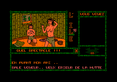 Pour tenter de l'amadouer, je lui fais un sourire de crétin. L'homme me demande alors de lui offrir la pierre de feu. Ça, c'est bien ma veine... Tout à l'heure, abrs que je creusais dans le sol au pied d'un palmier, j'ai découvert un vieux briquet. Cet objet, qui était bien la preuve que d'autres avant moi s'étaient déjà égarés sur cette île, je l'ai bêtement laissé sur Te sable : normal, je ne fume pas... Je ne pouvais me douter qu'il me faudrait bientôt l'offrir à un sorcier... Alors que mes genoux entament un flamenco en jouant des castagnettes et que mes dents accompagnent leur rythme endiablé, je respire un bon coup et amorce un demi-tour. Vais je parvenir à retrouverle briquet avant que le sorcier et sa tribu m'aient mis à mort ? Mais, ô surprise, je ne suis même pas poursuivi. Ubi aurait-il demandé à ses scénaristes une aventure plus simple que les autres ? Après deux ou trois heures d'exploration, me voici parvenu au terme de cette mission qui, malgré sa simplicité de progression (déplacements par flèches et redéfinition du clavier numérique pour les actions fréquentes : saluer, donner, load, etc), m'a fait découvrir de bien jolis écrans sur CPC. L'Ile constitue un bon soft d'aventure pour tous les néophytes. En revanche, le suspense est trop peu présent pour retenir longtemps un aventurier fou devant son clavier. Enfin, si vous faites partie de cette catégorie de joueurs, rien ne vous empêche d'y faire un tour, juste pour un petit moment de détente. LLG, MICRONEWS |