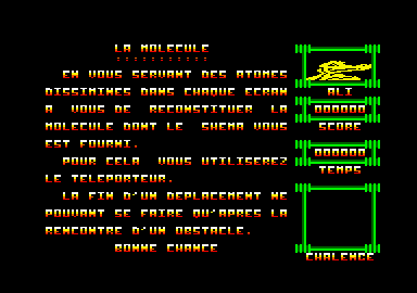 N'ayez crainte, nul logiciel éducatif, mais un redoutable casse-tête ayant pour décor les confins de la matière. Une configuration moléculaire vous est proposée par l'ordinateur. A vous de reconstituer le modèle par l'assemblage de divers atomes au moyen d'un téléporteur. Les indications nécessaires sont incluses. Sauvegarde Sauvez sous le nom évident de «MOLECULE», le programme Basic principal. Entrez ensuite par Amsaisie V.2 en vous reportant à son mode d'emploi, les codes hexadécimaux du second listing. Spécifiez 9700 comme adresse de début et sauvegarder le fichier binaire sous le nom «MOLBIN». Si vous le désirez, morcelez votre travail en plusieurs fichiers (M1, M2, etc.). Ces derniers devront ultérieurement être chargés à la suite (LOAD "M1" : LOAD "M2", etc.) après un MEMORY &96FF et sauvegardés ainsi dans un fichier unique: SAVE "MOLBIN",b, &9700, &9AD Claude Le Moullec, MICROMAG