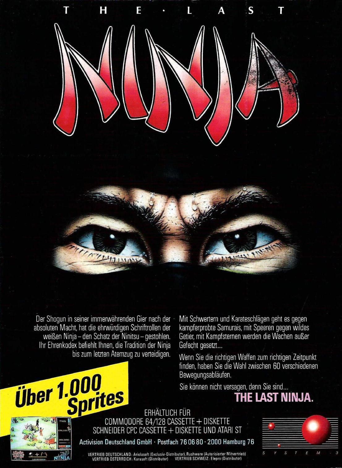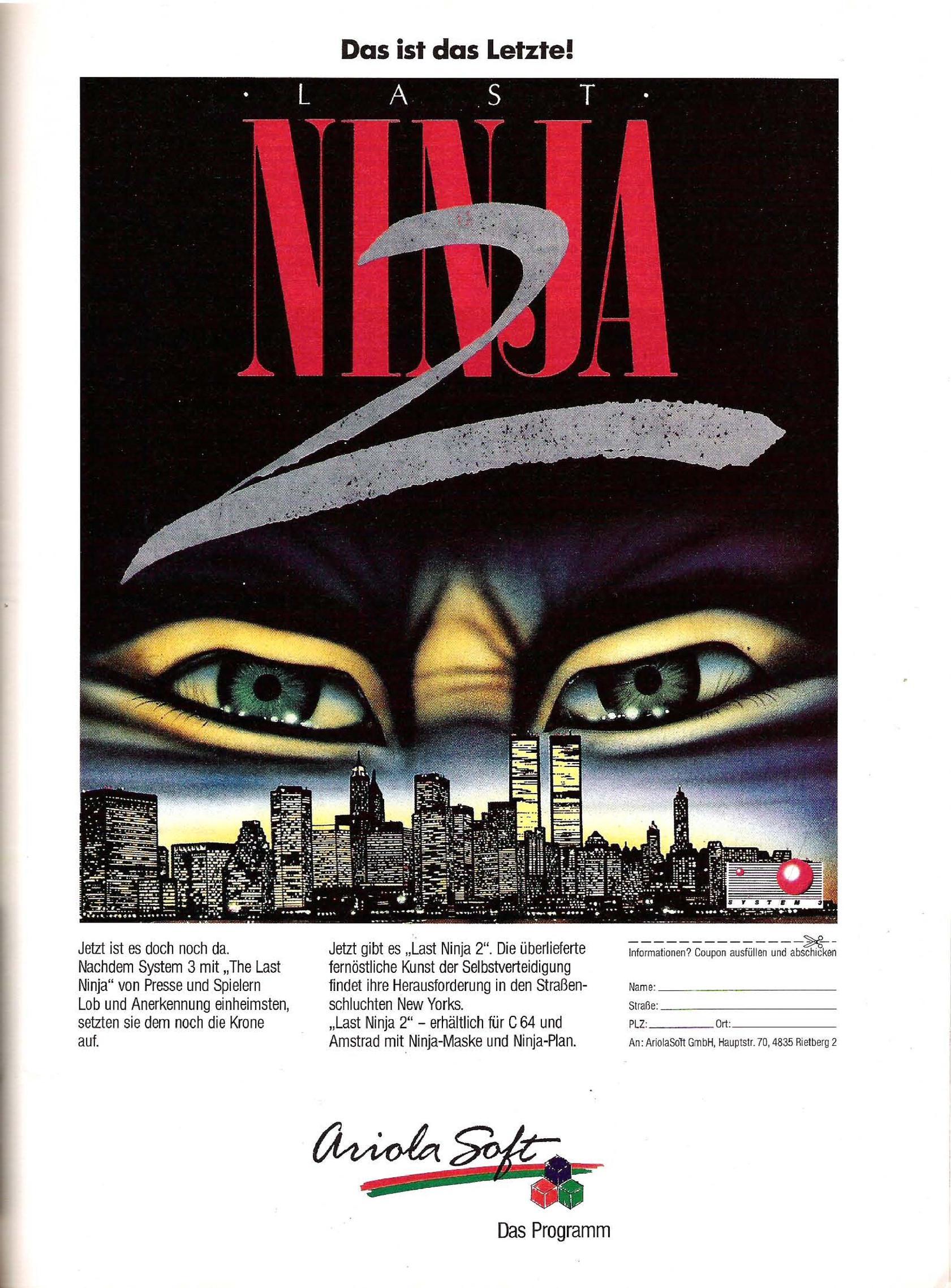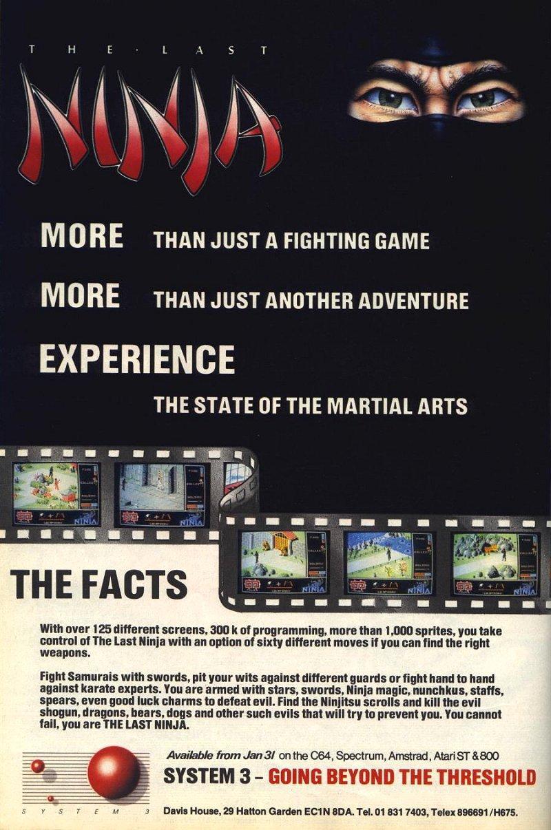 The Last Ninja 2 inaugure un genre nouveau : l'aventure art martial. Il y a eu un Last Ninja en 1987. mais nous n'en avons pas vu la couleur sur Amstrad CPC. Le jeu divisé en six parties fut un must sur Commodore 64 (meilleur jeu de l'année en 1987) ; il représentait deux ans de travail difficile et, comme le précisait Mark Cale, le concepteur du jeu : "trop de problèmes ont surgi pour l'adaptation sur Amstrad".