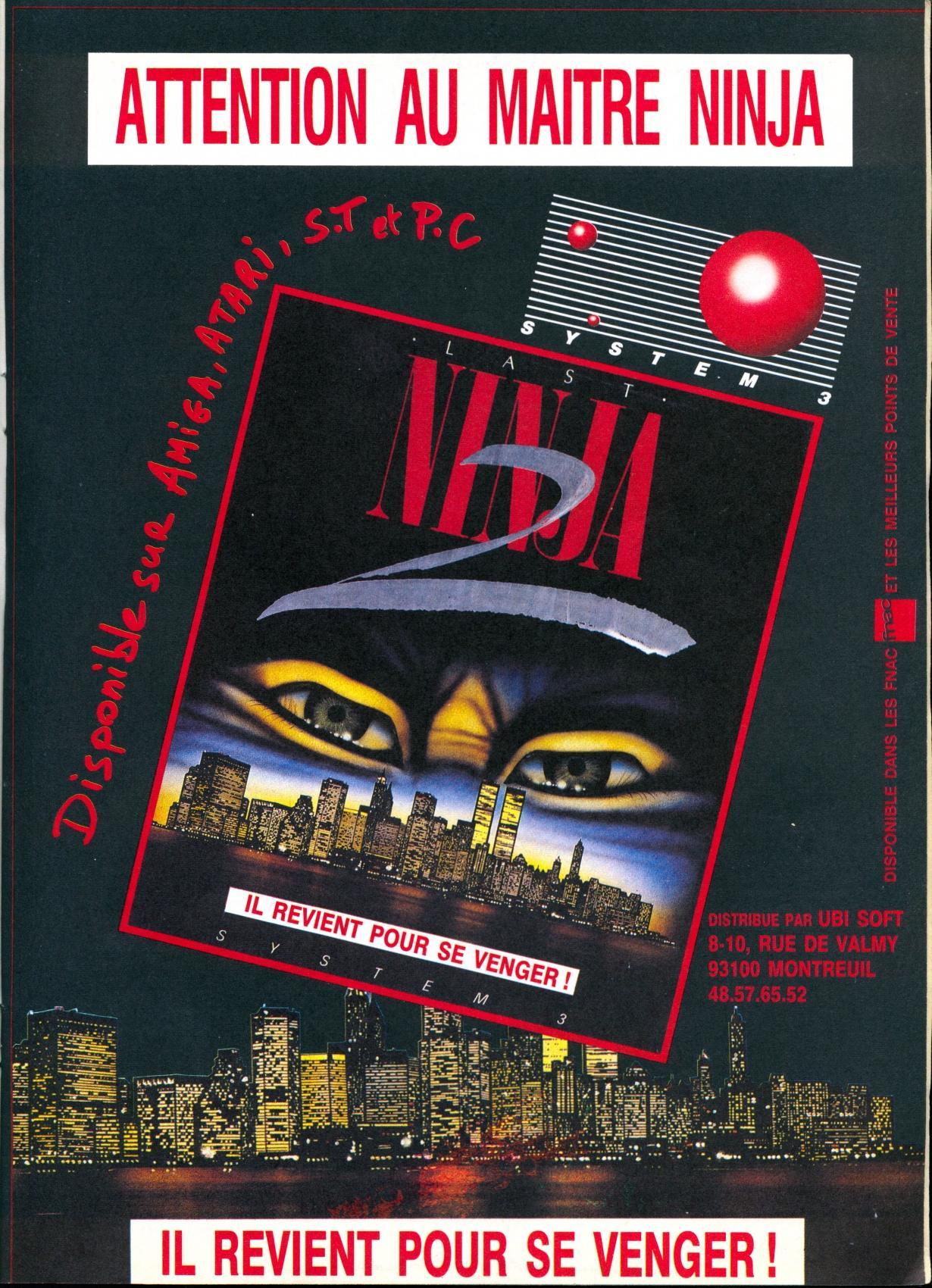 Effectivement, avec plus de trois cents écrans de jeu et quelque cent animations différentes, il aurait été difficile de réaliser un tel jeu sur CPC étant donné l'absence dune gestion de sprites dans la ROM de la machine. Mmouaaiis !!! Avant de parler du deuxième épisode, présentons le package, qui inclut une super cagoule de ninja en toile et un shuriken (made in Taïwan) en caoutchouc, un plan en 3D sans grande utilité et un livret de vingt pages de délire total !!! Pour l'histoire, les ninjas vécurent au IX eme siècle. Mystérieux, combattants de la nuit, ils furent très redoutés par les samouraïs. Au XIIe siècle, ils disparaissent. De nos jours, seuls quelques adeptes pratiquent encore l'art ninjutsu dans certains temples japonnais. PREMIER NIVEAU : Allez, passons aux choses sérieuses. Le jeu débute sur le balcon d'une tour. Pas le temps de visiter la terrasse. Passez dans la salle suivante ; là, ne vous occupez pas trop de votre premier ennemi et éclatez le panneau qui clignote d'une bonne patate. Retournez sur le balcon et, ô miracle, une trappe s'est ouverte ! La suite des événements se déroule dans un parc charmant ; ne laissez surtout rien au hasard car les problèmes vont surgir très vite. Ramassez les objets en cours de route : clés et plans. N'oubliez pas les nunchakus dans les WC pour dames (tiens, bizarre !!). Dans le parc se trouve le bâton indispensable pour finir le premier niveau, ainsi que la clé qui servira à ouvrir la gjrille... Continuez et traversez la rivière grâce à la barque puis évitez les abeilles meurtrières. Maintenant, la route se sépare. A gauche, c'est pour plus tard. Dirigez-vous donc à droite et sautez sur l'îlot, où vous trouverez une autre barque amarrée. Détachez-la avec le bâton ; elle vous permettra de traverser l'écran situé à gauche. Faites demi-tour et prenez la route de gauche (woouaaa !!! assez difficile, la prise de tête quoi !). SECOND NIVEAU : UN NINJA A N.Y. On continue au niveau deux. Vous êtes alors en plein New York. Vous vous trimbalez dans des rues genre mal famées avec des keu-pons ; pire encore, même les flics se mettent de la partie. Le meilleur moyen est de se tirer le plus vite possible, et de se procurer rapidement une épée. Cette dernière se trouve dans un magasin et, là, c'est l'éclate (comme durant tout le jeu d'ailleurs). Pour faire bonne impression au commerçant, défoncez la porte d'entrée d'un bon coup de tatanne. Pour la suite de l'aventure, il vous faut trouver un cocktail Molotov, qui vous servira pour faire rôtir un crocodile obsédé par l'idée de planter ses belles dents acérées dans le gras de vos jaunes (ninja oblige) fesses. En d'autres termes, ça s'appelle le mordant informatique. Attention, n'oubliez surtout pas un seul détail. Effectivement, si vous ramassez le cocktail Molotov dans le niveau deux, il vous servira pour la troisième partie. De même, le plan que l'on trouve tout au début du jeu ne sert que dans la sixième et dernière partie du soft. Vous ne partirez du second niveau qu'après avoir trouvé une barre à mine, située sous un abri, que vous devrez utiliser un peu plus loin. Elle vous permettra d'ouvrir une bouche d'égout qui vous fera accéder au niveau suivant. TROISIEME NIVEAU : Mais que fait notre ninja dans les égouts ? La troisième partie semble moins difficile, une fois que vous avez décalqué les quelques touristes qui traînaient dans le coin. Ramassez le crochet situé dans une pièce à droite ; il vous permettra de franchir la grille un peu plus loin. Une fois celle-ci ouverte, laissez vous descendre... La première fois, vous vous ferez avoir. En effet, plus bas, il faut éviter les mâchoires de notre ami saurien. Alors, n'oubliez pas d'allumer votre cocktail Molotov, grâce à une des torches qui se trouvent à votre hauteur. Evitez les rats en bondissant ou achetez-vous une paire de béquilles à Elysold, et pour finir, portez-vous à la droite du crocodile très agressif. Puis envoyez-lui le cocktail en pleine tronche. Vous pourrez admirer la cuisson de brochettes de cuisses de croco (très répandues dans la cuisine ninja). MAGIC NINJA Quels sont les défauts ou les manquements de ce soft 7 Les quelques difficultés dans le maniement du personnage disparaissent après une bonne pratique du jeu. A noter qu'il est impossible de jouer au clavier seul. La barre d'espace sert pour le choix des armes, la touche return pour utiliser un objet. Les amoureux de ce mode de jeu devront ressortir leur joystick. Trois modes sont au programme. Le premier est relativement difficile parce que le ninja répond assez mal, surtout dans les combats. Le deuxième, plus précis, est très important dans le quatrième niveau mais n'est pas efficace pour les phases de combat. Le troisième reste le plus complet et le plus facile, pour se placer dans les passages ou pour les opérations délicates (exemple : la rivière ou les hauteurs). Pour le saut, vous avez trois systèmes : court, moyen, long. Je vous conseille le mode long (joystick vers la direction du saut) ; les deux autres ne sont pas à utiliser. Côté sonore, c'est pas le Pérou, c'est tout juste oriental, avec des musiques différentes pour chaque niveau de jeu, donc six au total. Les graphismes ' sont très réussis, monochromes et très détaillés. Les décors, vastes, et les animations, superbes, enchanteront tous les fanas du genre arcade/ aventures. En définitf, The Last Ninja 2 est vraiment un soft qui vaut le détour, un must incontournable quoi !!! Le Micromane THE LAST NINJA 2 de SYSTEME 3 A100% n°10 , p26-27 |
