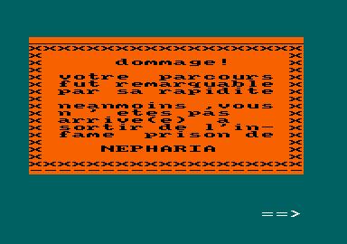 Népharia annonce dès son chargement la couleur : “jeu d'aventure de caractère très méchant de par sa difficulté et son analyse syntaxique”. On vous propose alors de l'insulter “pour voir”. Ne vous en privez pas surtout que vous aurez de bonnes raisons... (essayez un mot de cinq lettres commençant par M et finissant par E...). Le but est de vous évader du Bagne aux multiples pièges, de braver le désert infernal qui l'entoure et reconquérir, Prince Marc, votre trône usurpé. Un bon conseil, dans ce genre de jeu, mieux vaut tout noter. Regardez bien les dessins, ils sont — paraît-il — de véritables mines de renseignement...Les scènes de présentation sont très belles, le graphisme semble très soigné. Par contre, si vous trouvez comment débuter dans cette aventure, écrivez-le nous... Oh là là... Pour fanas d'aventures, nuits blanches assurées. De notre coté, si on trouve des solutions, on vous le fera savoir... Pour l'instant, je suis bien au secret dans le cachot de Népharia et me demande comment en sortir. Le graphisme du premier tableau, que j'ai eu tout le loisir d'admirer, est bon. Comment sont les autres ? Il paraît qu'il existe quatre-vingt salles dans ce maudit lieu et que, dehors, outre tous les dangers, 1600 lieues de désert vous attendent... Amstrad Magazine n°6