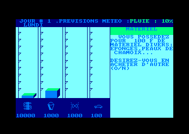 Vous voilà laveur de voitures. Mais attention ! Vos outils ne sont pas les seaux et la peau de chamois mais votre tête et vos talents de chef d'entreprise. Vous commencez le lundi avec 300 F en poche, 100 F de matériel divers et vous espérez finir la semaine millionnaire ! Vous devez, chaque jour, prendre des décisions concernant les achats de matériel, la publicité et le prix d'un lavage. Selon la météo, vous laverez plus ou moins de voitures et, par conséquent, vos poches se rempliront ou se videront. Voilà un petit jeu en basic, très restreint, qui aurait eu sa place dans la rubrique "listings" mais certainement pas dans le commerce, au milieu des autres logiciels de simulations d'entreprise. Il n'est pas possible de prolonger l'expérience au-delà d'une semaine, la quantité de voitures lavées est souvent complètement fantaisiste, etc. Un achat à éviter, donc. Dommage ! |