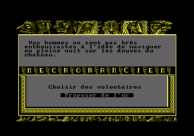 Le Nécromancien de Ubi Soft devrait Inaugurer une série de logiciels d'aventures textuelles proches des livres « dont vous êtes te héros » que vous connaissez certainement. Rien à frapper, il suffit de choisir entre plusieurs options. En cas d'échec (c'est fréquent), le jeu repart d'un embranchement antérieur, mais pas au début. Heureusement car la taille du logiciel rendrait toute autre solution tellement fastidieuse qu'elle deviendrait vite injouable. Vous incarnez un jeune mercenaire et, vous affrontez les sbires du mystérieux nécromancien pour délivrer an ami prisonnier Hommes-lézards, morts vivants, bandits, guerriers, monstres, traînes concourent à créer une ambiance angoissante. Le principe est intéressant, le scénario complexe, correct, mais des auteurs de grande envergure pourraient faire « décoller » le genre. En effet certaines situations donnent une impression de déjà vu ainsi : « Je nage sous l'eau dans un tunnel qui mène dans les entrailles du château et une grille rouillée me bloque, que faire ? » . Ceci dit, les recettes trop éprouvées peuvent aboutir à de bons plats. A condition de ne pas les resservir. Gare au deuxième épisode !