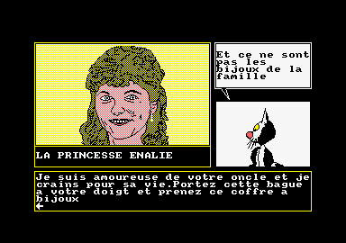 Avec le Passager du Temps, l'aventure est réussie à tous les niveaux : l'action qui est parfois déroutante, le graphisme qui est d'un réalisme surprenant, le son qui vous crée l'atmosphère, sans compter les facilités des commandes ! En effet, toutes les touches (moins une !) du pavé numérique sont préprogrammées, ce qui vous évite de faire des efforts considérables pour taper les ordres les plus fréquents tels qu'EXAMINE, PRENDS, DISCUTE AVEC (vous imaginez le gain d'énergie...). Vous pouvez même réafficher la dernière phrase tapée ! Et pour terminer, il faut absolument que je vous reparle du compagnon qui vous seconde tout au long de l'aventure pour vous aider à avancer, à garder le moral, à agir avec humour... j'ai nommé : LE CHAT. Dès le premier regard, vous tombez sous le charme... AMSTAR n°7 |