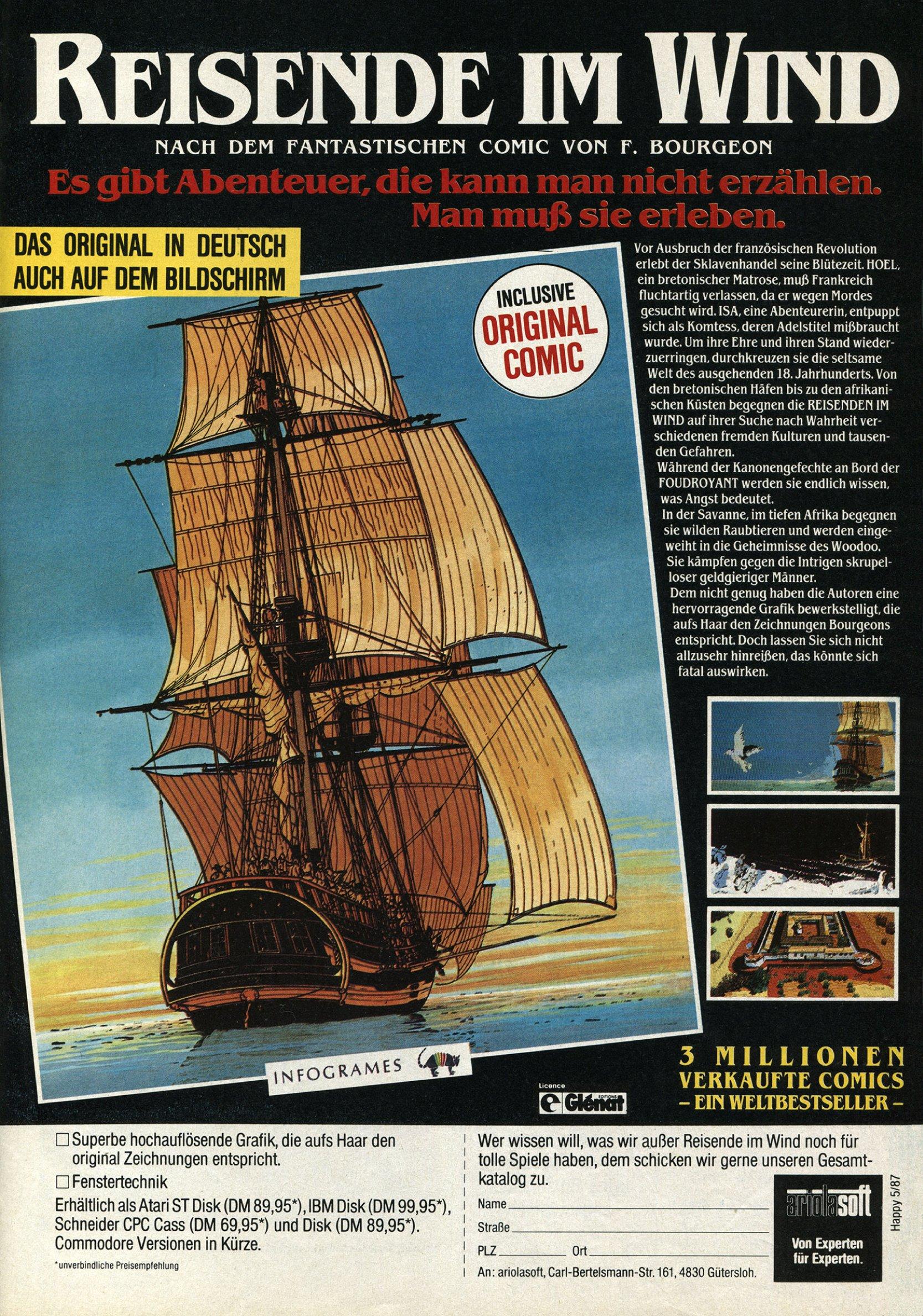 AventureSi vous aimez la mer, le bateau, le grand large, l'aventure et l'exotisme, ce logiciel s'adresse particulièrement à vous. Vous êtes transformé en metteur en scène et devez dérouler à l'écran, dans les meilleures conditions possibles, toute une histoire de B.D. Vous trouvez avec cette aventure une adaptation fidèle de la bande dessinée du même nom que nous devons à François Bourgeon. Les principaux héros sont toujours ISA, héroïne audacieuse à la recherche d'un idéal et MOEL, marin breton courageux et audacieux ; d'autre part, il ne faut pas oublier que toute l'histoire se passe à la fin du XVIII siècle : il faut donc se mettre dans l'état d'esprit de cette époque pour comprendre certaines réactions. Cette superbe réalisation vous présente sur votre écran une partie graphique où se déroule l'action d'une part et des icônes, ainsi que des textes où vous voyez les personnages que vous interprêtez à ce moment précis. Vous avez la possibilité d'interpréter jusqu'à 15 personnages différents !...