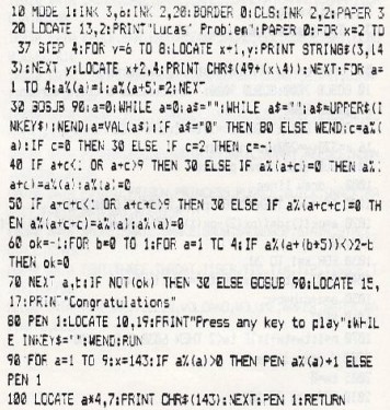 Here's a quick ten-liner that dropped onto the desk from somewhere. It's simple but one of those little brain teasers you won't leave until you solve. The concept is simple. A board consists of nine holes, in a row. Four blue chips are positioned in the first tour holes and four red chips are positioned in the last four hales. The aim is to move all the blue chips to the last four holes and t:ic reds chips across to the first four. Easy? Different coloured chips go in different directions - they can't go backwards! The chips move forwards by either jumping over one other chip into the vacant space, or if the space is immediately in front, jus; stepping into it. If all this sounds confusing, don't worry - all will be revealed after a few plays. Oh, and if you gel stuck just press zero and the game starts again.