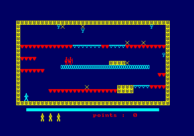 Récupérer des clés suspendues au plafond, dans un lieu peuplé de monstres et piégé à souhait, mais vous n'y pensez pas ? !..Mode d'emploi : Ce jeu utilise indifféremment le joystick ou les touches directionnelles et COPY. Attention lors de la frappe de ce listing : aux lignes 1450 a 1490, 1890 et 1900, l'espace entre guillemets est occupé en fait par une flèche bas (CTRL/J) suivie d'une flèche gauche (CTRL/H).