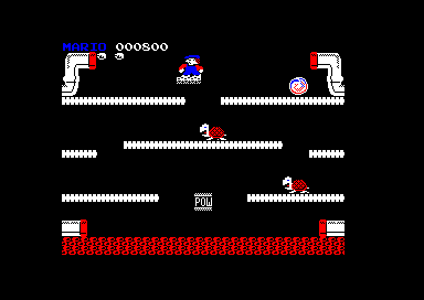 MARIO BROS, sigue en la línea que está marcando la moda de los video juegos domésticos. De nuevo tenemos una conversión de uno de tantos famosos arcados de las maquinistas pegajosas de los bares. ¿Bueno? Así, así... mejor dicho: casi bueno. El caso es que Mario Bros sin ser un juego demasiado llamativo es bastante fiel al original. Como juego no es nada de otro mundo pero cumple perfectamente con su cometido: entretenernos. Nuestro protagonista es Mario, si jugamos solos, pero si lo hacemos con un amigo entrará también en escena su hermano Luigi. De lo primero que nos percatamos al empezar a jugar es del entorno en el que tendremos que movernos: estamos en una fábrica de discos. Pero no estamos solos, ni mucho menos. A nuestro alrededor se mueven criaturas asquerosas (al empezar son tortugas) que resultan mortales para nosotros. La fábrica en la que trabajamos cuenta con un pequeño problema: sus suelos son los más resbaladizos de todos los que he visto, tanto que es muy difícil, imposible, parar a Mario o a Luigi en seco. Primera regla: controlar la frenada. Para sobrevivir en semejante tugurio tendremos que actuar con rapidez y cautela, calcular bien las frenadas y los saltos y, por supuesto, acabar con todos los bichejos que se mueven a nuestro alrededor. Esto en un principio puede parecer sencillo pero no lo es tanto si tenemos en cuenta la forma en que debemos acabar con ellos. El procedimiento es el siguiente: Para matar por ejemplo a las tortugas tendremos que valemos obligatoriamente de nuestras duras cabezotas, es decir, tenemos la cabeza tan dura que con ella podemos doblar las plataformas. Si en el momento en que pasa por ellas algún bichejo damos por debajo de la plataforma con nuestra cabeza, conseguiremos dejarla patas arriba y por lo tanto indefensa. A partir de ahí disponemos de un breve espacio de tiempo para acercamos y saltar sobre el, logrando matarle. Si no nos damos prisa lo más lógico que ocurra es que la tortuga o lo que sea se levante y siga tras nosotros. Este es el procedimiento general para acabar con nuestros enemigos, que son muchos. Mientras jugamos habrá otros objetos que nos incordiarán, este es el caso de los discos que aparte de incordiarnos nos quitan una vida. Por otra parte encontraremos algunos que nos darán puntos si los recogemos (los más pequeños, normalmente). Pasando ya de la película. ¿Cómo andan los gráficos y demás sutilezas? Regular, regular. Los gráficos en concreto se parecen tanto a los de la máquina original que prácticamente tenemos un Manic Miner. Por lo que respecta al sonido tres cuartas partes de lo mismo, unos cuantos ruiditos raros y punto. El movimiento de Mario y su hermano Luigi es bueno y la derrapada está bastante lograda. La adicción es buena, el juego atrae y te divierte pero no sabemos si lo seguirá haciendo después de haber jugado unas cuantas veces. Pese a todo MARIO BROS es un programa con gancho. Juégalo y nos dirás. Nostros ponemos los cargadores para ayudarte. Amstrad Acción