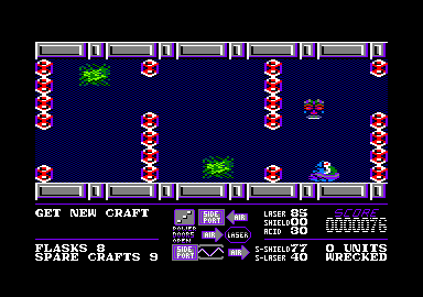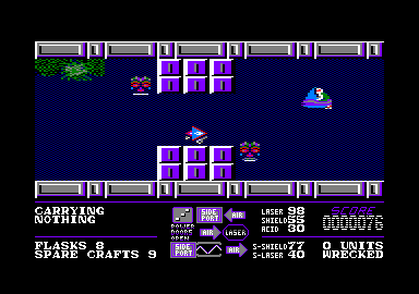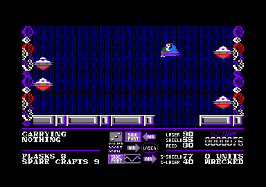 Lorsque vous pénétrez sur l'as-téroide où se trouve Métaplex, votre vaisseau dispose bien sûr d'un laser et d'un bouclier; deux opérations sont possibles en cas de problème : en effet, si votre laser est à zéro, il est possible de le recharger, par ailleurs, lorsque votre bouclier n'est plus actif, un certain nombre de vaisseaux de rechange sont disséminés dans le complexe (à vous d'en trouver l'emplacement). Bien entendu, Métaplex est fortement peuplé d'extra-terrestres qui sont en principe facilement détruisibles mais qu'il vaut mieux éviter de toucher car, alors, vous risquez d'avoir une forte consommation de vaisseaux pour cause d'épuisement de bouclier. Venons-en aux choses sérieuses; un seul moyen existe pour détruire ces horribles sources d'énergie : il s'agit de leur verser dessus une bouteille d'acide... Par conséquent, il faut tout d'abord chercher une bouteille vide (une à la fois !) dans ce dédale de métal pour ensuite trouver la réserve d'acide qui subit une fuite ce qui facilite les choses pour faire le plein de la bouteille. Ensuite ? Il suffit de se rendre au-dessus d'une unité d'énergie et de tout lâcher, tel un canadair. Bien que ce logiciel soit bien réalisé, on ne peut pas dire qu'il soit d'une exceptionnelle nouveauté et originalité; malgré tout, le jeu est suffisamment complexe pour vous retenir pendant quelques temps devant votre micro d'autant plus qu'il est servi notamment par une bonne animation.