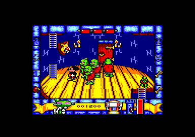 LOULOU : ... ogres et fantômes, une fois supprimés, laissent un objet à récupérer. MISS TICK : Hummm... De plus il s'agit d'objets utiles : de l'eau pour recharger le pistolet, des clés pour franchir les portes, des bombes pour éliminer tous ses adversaires d'un coup, une tête d'oiseau pour défier temporairement la pesanteur, de la glu pour figer les ennemis sur place. PAT HIBULAIRE : Ouais bon allez, j'vais GEO TROUVETOU : ... avec notamment de très bons scrollings... DAISY : Les graphismes sont vraiment une réussite... DONALD : Malheureusement, le jeu manque cruellement d'intérêt et l'action devient vite répétitive. DINGO : Ouaif, on s'embête un peu-Quand est-ce qu'on s'eouche ? PAT HIBULAIRE : Ouâis, faut vraiment aimer Mickey quoi, grrrr... MICKEY : Moi je suis content, pour mes 50 ans, la société Gremlin a bien respecté le style de mon père, monsieur Disney. M'enfin, ce n'est pas là l'événement majeur de l'année ludique... Robby & Michou , A100% n°7 |
