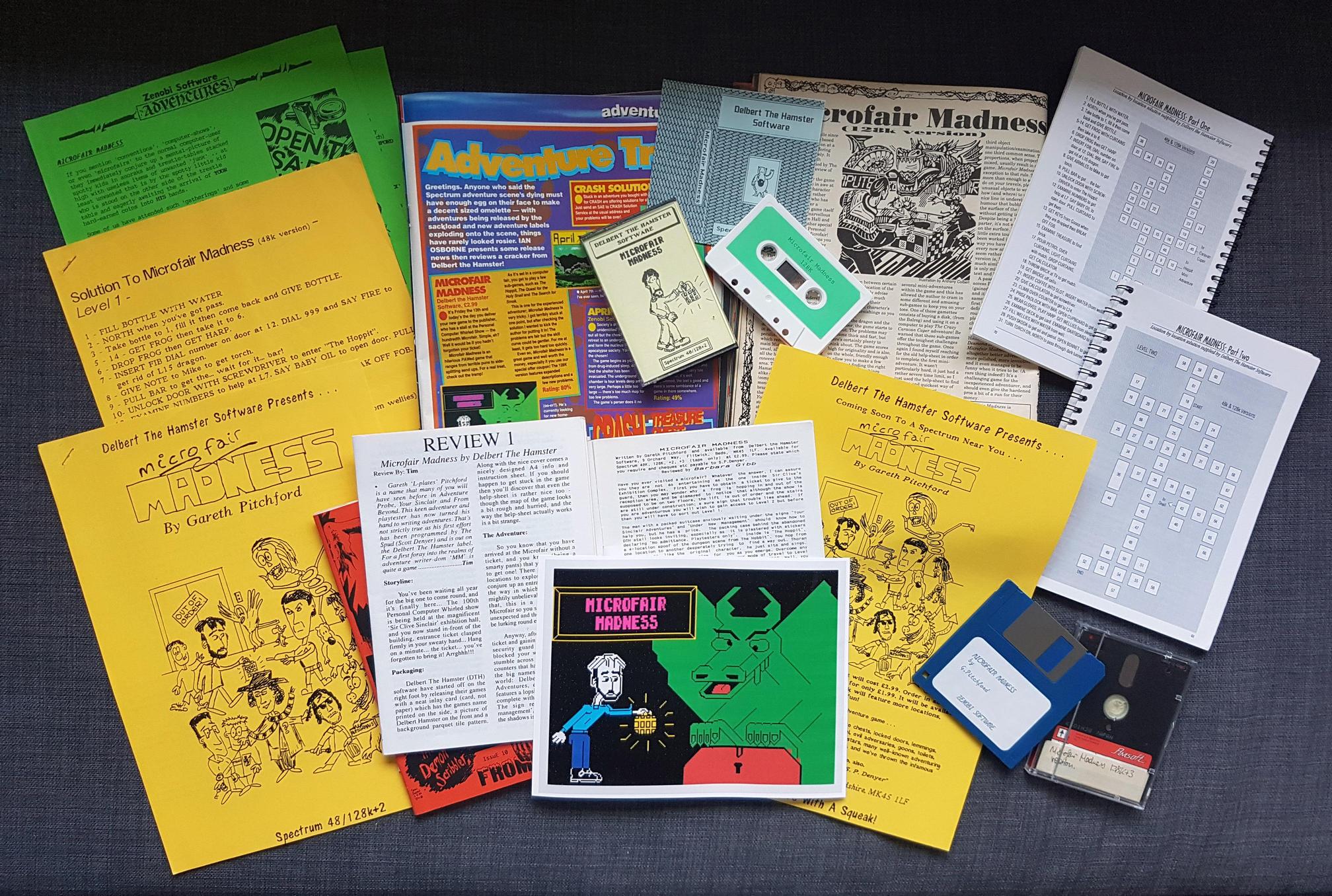 Microfair Madness started lifed as a text adventure for the ZX Spectrum, released by Delbert the Hamster Software in 1991. In 1992, the Adventure Workshop produced a conversion of the game for the Amstrad CPC and PCW range of computers, running under CP/M.