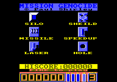 La deuxième tient à la nature du logiciel : l'attaques d'objets divers sur fond de scrolling vertical. En effet rien de plus impersonnel que ces batailles entre engins aux formes variées qui semblent se diriger d'eux mêmes. Le titre, en ce qu'il suggère de nombreuses victimes hors engagements militaires, ne convient absolument pas au contenu du jeu. Les auteurs et l'éditeur n'ont pas été si mal inspirés pour le programma lui-même. Le genre, un petit engin qui attend les vagues d'autres engins, ne fournit habituellement pas la base de débordements d'imagination. Mission Génocide manque d'originalité. Certes ces vagues d'assaut se succèdent à un rythme rapide, chaque sorte de dragée volante virevoltante, chaque variété d'avions bourrés de canons qui avancent en lignes successives tels des manifestants, chaque losange, flocon scintillant si dangereux pour votre appareil se meuvent avec aisance.