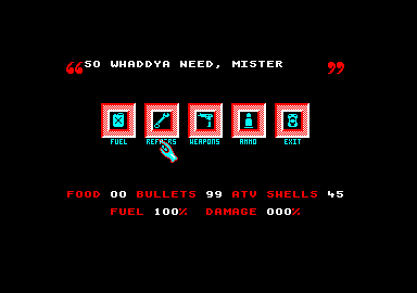 QUAND ON ARRIVE EN VILLE Après la guerre dont a souffert notre planète, la famine s'est installée dans les villes. A bord de mon ATV muni pour l'occasion d'un canon très puissant, disposant de 50 obus et le réservoir plein, j'arrive dans la première ville où l'ignoble DrANoid fait régner la peur. Très vite, je m'aperçois que des voitures meurtrières sillonnent les rues à ma recherche et tentent de m'emboutir, voire de me réduire en miettes. J'en pulvérise une bonne partie avec mon canon, mais les munitions s'épuisent, tout comme mes réserves de carburant. Je m'arrête donc dans une station service. Le pompiste propose de me fourguer essence, armes et munitions ou d'effectuer quelques réparations sur mon véhicule en échange... de nourriture ! N'ayant pas prévu le coup, je le quitte, après qu'il m'eut signalé la présence d'entrepôts, qui sont pleins de trésors, et où personne n'ose s'aventurer. SIDI BRAHIM L'entrée des entrepôts est indiquée par deux flèches vertes, abandonne mon ATV et me décide à entrer, revolver au poing. Le pompiste ne m'avait pas menti : on trouve vraiment de tout là-dedans ! Du pinard, des boîtes de conserves, des armes, des munitions, des clés, de l'essence, de l'équipement pour ATV et même des ... ! Seul problème, l'accueil laisse vraiment à désirer. Des zombies sortent des bouches d'égouts (dans lesquelles il est déconseillé de tomber) et leurs étreintes portent un sale coup à ma vitalité. Pas de pitié, j'ouvre le feu. Je fais de même lorsque des débris obstruent les couloirs. Dans une pièce, je trouve un passe qui me permettra d'entrer dans l'arène de la ville. Ayant fait le plein de provisions en tout genre, je vide les lieux. Objectif : retourner voir le pompiste, puis, avec mon ATV tout neuf, trouver l'arène.