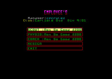 If there are any confirmed football fans left still standing, Multi-Player Soccer Manager might be just the thing to ease them gingerly into the new season. As its name suggests, you and up to three like-minded friends (if you can find three like-minded friends) can each control a national team. The game is run from a icon menu, with all the available options clearly displayed. Each player takes it in turn to deal with the running of his team. There are a multitude of decisions to make, ranging from extracting finances from the bank to altering the size and safety of your stadium. Your squad members have skill ratings which rise and fall. You must give them adequate training in the skills you think they should acquire. You could teach your goalie to head the ball, for example, or give your defenders long-range shooting skills. There is also a transfer market in which you can purchase any ace players available, or flog off your burnt-out has-beens to raise a few quid. As well as the team, you can pay through the nose for a better Coach, Scout or Physio. All will improve your chances in both the league and the cup. The only limit is your dosh. Buying one decent player will seriously reduce your wad, so tight-fistedness might be wise to start off with. There really are a whole host of options available to the diligent player. When playing with human managers as well as computer ones it can take quite a while for each player to make all the changes he feels are necessary. Once everybody is happy, you can play the next game. Unfortunately, there is no running commentary, or half-time status reports, so there isn't time for excitement to build during the game. The results of the four divisions are displayed page by page until you see how your lowly team has done. The game has 64 teams, up to four of which can be run by human players. Any of the team names can be changed, as can any of the players names. It is possible that you can get carried away with this option, and start renaming everything and everybody. This results in positively surreal league tables and team lineups; Amstrad Action was beaten by the Ninja Turtles, with a last minute goal by Donatello. Playing the game is made easy by the use of the joystick and the minimum of fiddly text inputting, but actually progressing up the league is tough. It is difficult to whip your team into shape without spending hours and hours trying, and you come to dread the results table. Yes, there you are, still at the bottom of Division Four. Luckily you can save and load from the main menu, so you can return time and time again to find that, yes, you are still at the bottom of Division Four.