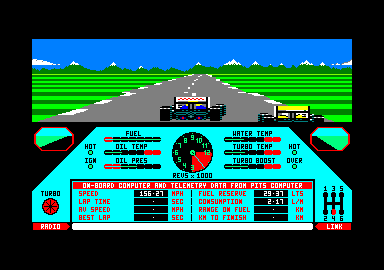 FEU VERT ! Votre moteur hurle tandis que vous libérez les 900 chevaux de votre Williams Honda. Vous accélérez à fond, passant rapidement les vitesses. Votre turbo peut s'exprimer entièrement dans la grande ligne droite du circuit de Monza, le plus rapide du monde. Dans vos rétroviseurs se profilent les silhouettes ... heu... profilées des bolides de vos adversaires. Vous jetez un œil sur le compte-tours : 10000 tr/min, ça va. Vous ramassez prestement votre œil, et vous vous apprêtez à négocier la frande courbe. Ralentir, rétrograder, le moteur hurle en sur régime, l'aiguille du compte-tours s'affole dans le rouge, attention à la surconsommation de carburant ! Déjà il faut accélérer pour résister à l'attaque de la Ferrari ; vous donnez alors la pleine mesure de vos talents de pilote pour parer l'assaut. Ca y est, un premier tour de circuit est bouclé, les données s'amoncellent sur votre ordinateur de bord : vitesse actuelle, temps par tour, vitesse moyenne, meilleur temps réalisé au tour...