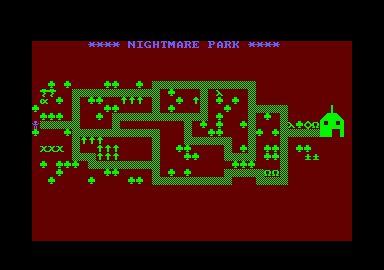 NIGHTMARE PARK is in fact a compendium of 14 games. The task of the user is to gain as many points as possible travelling through a maze beset by obstacles at every turn These infuriating obstacles are overcome by a combination of skill, sharp reflexes or by sheer good luck making Nightmare Park a suitable game for all ages.