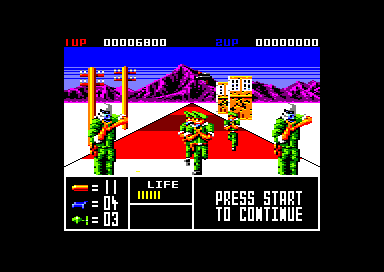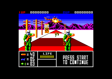 Le jeu comme Opération Wolf par un "Rescue all hostages". Sauf qu'au premier tableau, les terroristes (forcément des métèques puisqu'ils sont tous coiffés de khéfiehs palestiniens) déboulent comme s'il y avait du fric à ramasser. Votre noble activité consiste à tirer dans le tas en détruisant au passage les hélicoptères dans le ciel qui larguent parfois des bonus. Dans le niveau suivant, c'est un scrolling horizontal qui apporte son lot de Palestiniens. Puis on conduit une jeep et au quatrième et dernier niveau, on investit un avion en tirant un peu plus sélectivement car il vaut mieux que les hostages soient libérés vivants. Et pour finir en beauté, comme dans tout shoot'em up digne de ce nom, il y a un gros, vraiment très gros méchant à la fin.