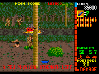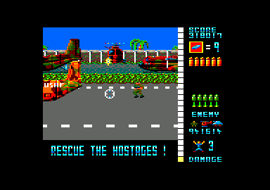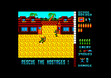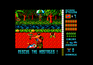 Eh bien, je ne sois pas comment ils ont fait, je ne veux carrément pas le savoir, mais ils l'ont fait ! Mais laissez-moi vous raconter le soft dans son détail, vous n'allez pas en croire vos joysticks ! Que je vous explique le scénario en douze mots. Si, ne rigolez pas, le scénario est effectivement si riche qu'il tient en douze mots, pas plus, je vais le prouver : vous, gentil soldat, tuer méchants communistes dans pays ennemi pour libérer otages. Voilà, c'est fait, pari tenu. Vous, compris ? Alors vous y'en à prendre grenade, mitraillette et assurance-vie et nous y'en à embarquer pour la jungle hostile. Ce qui fait plaisir avec ce genre de jeux, c'est que les créateurs arrivent toujours à trouver des scénarios de moins en moins riches, de plus en plus primaires et de moins en moins originaux. Par exemple, lorsqu'on avait vu Commando ou Ikari Warrior, on croyait avoir atteint un sommet dans le jeu bestial et primaire, mais non ! Ils ont encore réussi à faire plus fort.