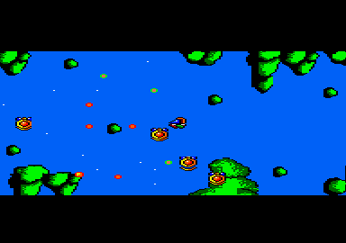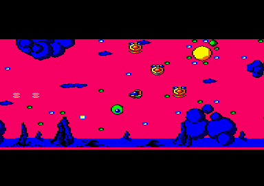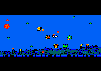 Aliens tend not to like being shot and so they do their best to annihilate you. There are many types of aliens and they move in differ-ent attack patterns. On higher levels some of the aliens shoot back at you and if they bump into or shoot you then one of your five lives is lost. The aliens appear at random in groups of three and sometimes they materialise right where your ship is, frustratingly resulting in your demise. FIRST DAY TARGET SCORE : 40.000 points GREEN SCREEN VIEW : Some things are tricky to see in colour and even more difficult ta spot in green. SECOND OPINION : Delicously smooth horizontal scrolling, fast action and superb graphics make this a very scrumptious game. Although not top in the originality stakes, its great tor a relaxing - and challenging - blast. There are eight levels to complete and seven bonus screens To go to the bonus level you must collect a letter "B" that appears on screen periodically In the bonus level you merely have to survive until the end of the wave by shooting or dodging the incoming aliens. Alter the bonus wave you go forward to the next level in which there is a new landscape and more dangerous aliens. A good tune plays on the title screen and in game effects are more functional than anything. There is nothing wrong with them as such, but they do tend to irritate you after a while. The smooth scrolling landscape extends into the border of the screen and is a small chunk of screen which wraps around at the edges. The landscapes are very colourful and so is everything else for that matter Sometimes the aliens or the ship merge with the background and you can't see where you are going of who is around you. There is not much thought required in this game, but it's a fast and addictive shoot-em-up that will keep you blasting away long into the night. Eight levels may not sound like much, but they do get hard very quickly Probably one of the best zap games in recent months GBH, AA |