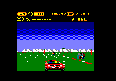 Je me dirigeais d'un pas décidé vers Out Run. En homme de métier, je glissais une pièce dans la fente prévue à cet effet, savourant déjà les moments de joie qu'allait me donner la conduite sportive d'un véhicule rapide, et ce dans les décors les plus « West Coast » que l'arcade ait jamais offert. Puisque j'avais la chance de fréquenter une salle bien équipée, je me carrais voluptueusement dans le siège de pilotage. Ensuite, ayant réglé le poste de radio de mon véhicule sur la station FM de mon choix, je démarrais sur les chapeaux de roue, histoire d'impressionner la blonde que les dieux de la vidéo avaient eu la bonté de mettre à mes côtés, là, sur l'écran de jeu. Maintenant, je suis devant mon CPC. La tête encore pleine des souvenirs passés, je regarde tristement mon écran. Certes, il est indéniable que les dessins sont bien réalisés, assez fidèles à la version originale et il est non moins vrai que cette version CPC est bien meilleur que celle dédiée au Commodore : sur cette dernière en effet, la blonde craquante a été remplacé par une brune, fort agréable ma foi mais tout de même. Pour commercer, la Ferrari Testarossa est muette et si ce n'était le nuage de fumée produit par la gomme, quand elle mord cruellement l'asphalte, en dépit de l'immobilité des roues, on se demanderait si le niveau sonore du CPC est bien au maximum. De plus, pas de radio. Heureusement qu'une cassette reprenant la bande son originale du jeu d'arcade contenu dans l'emballage permet de retrouver un peu de l'ambiance du «vrai» Out Run.