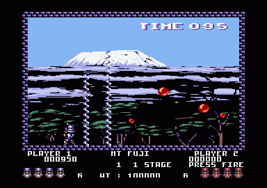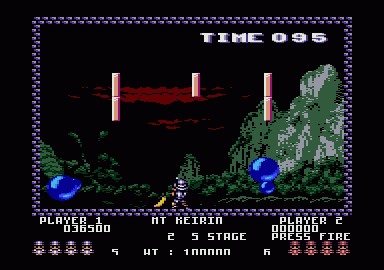 Pang is a conversion of a smash arcade game. Fans of the arcade are just going to love the Amstrad console version to death. The screen layouts, puzzles and playability are identical - this conversion is beautifully faithful to the original. There isn't really a plot to Pang, as such. All you really need to know is that at any second you're going to be attacked by one, two, three or more giant balloons. If you get hit by one you lose a life - but you do have a defence. You can fire a harpoon at these gaseous invaders, which splits them into two. OK, so you've now got twice as many balloons to dodge, but that's life. Hit these new (smaller) balloons with your harpoon, and they each break into two more... only the tiniest sub-balloons can finally be blasted into oblivion. Inside each giant balloon there can be as many as eight tiny balloons trying to get out. If you want to stay alive, you should tackle the gasbags carefully, keeping the number on the screen to a minimum. Don't take too long over it, though, because you've a time limit for each level... ...And there are plenty of levels to get through. You start off with a map of the world and the option of starting your quest at any one of several famous locations. Wherever you choose to start, there are three screens to get through before you fly (not in a balloon, though) to the next location. The screens start off easy enough, but that soon changes. Blocks start appearing on-screen, making it difficult to judge how the balloons will bounce. Some of the blocks can be shot away too (usually unintentionally!), further adding to the chaos. You soon realise that Pang isn't just a test of reflexes and strategy, but a tough li puzzle game too. For example there is one screen where as well as simply staying alive you have to stop more than a couple of the smallest balls dropping into a small enclosed section accessed by a ladder. With more than two in there, you simply can't find a gap to get in there and wipe them out... Life is certainly tough as a professional balloon-bagger, but you do have some help. If a crab appears from nowhere and goes scuttling across the screen, snapping its claws, don't worry. His claws are good at bursting balloons. If you walk into him you'll kill him, so leave him to it. You'll also encounter a large whelk now and again. He's not so good. Walk into him and you lose the ability to fire your harpoon for precious seconds. (If you walk into the crab, he turns into a whelk, by the way.) You can also collect weapons falling from punctured balloons. Your standard firearm is a harpoon (which looks like a giant corkscrew in use) but you can upgrade to a double harpoon, power-harpoon (stays on-screen for several seconds), vulcan missile (doesn't destroy blocks), dynamite (blows all the balloons into their smallest size), clock (stops the balloons for a few moments) and hourglass (slows the balloons). The thing is, these power-ups don't always give you want you want. For example, if you're right at the start of a tricky screen with loads of giant balloons, you don't really want to go blowing them all up into thousands (well, it seems like it) of little ones by picking up the dynamite. To avoid picking up weapons you don't want you have to not walk into them.