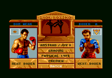 Les graphismes de ce soft tentant de retracer les péripéties des sportifs adeptes du Kick Boxing, et ayant eu le malheur de défier André Panza, te champion, les graphismes donc sont très sympas, tes couleurs bien choisies, et la fenêtre de jeu plus grande que sur le cousin CPC, surtout qu'elle est agrémentée de graphismes représentant les alentours très proches puisque touchant te ring. Le menu de départ vous permettra de choisir qui vous désirez affronter, et je vous conseille évidemment de ne pas commencer par Panza. car te combat finirait très vite chez le boucher, à commander une escalope, non l'emballez pas, c'est pour mettre sur mon œil tout de suite.