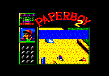 PAPERBOY OU PAPERGIRL Enfin, un jeu qui n'est pas sexiste. Vous pouvez incarner un livreur ou une livreuse du Dayly Sun. Avant chaque jour de la semaine, vous avez le temps d'étudier le parcours de vos livraisons. Les maisons des abonnés sont représentées en vert, et celles des non-abonnés en rouge. Les maisons à livrer ont une boîte aux lettres rouge. Chaque jour, vous aurez à livrer les trottoirs de droite et de gauche de la même rue.