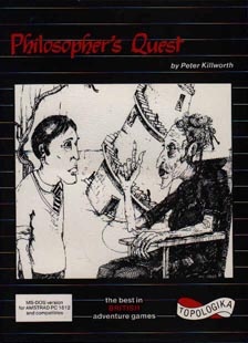 The bluib on the back of this package reads "Petei Killworth - the programmer - fell in love with adventures when he discovered Colossal Cave His own fust attempt at this new art form (Philosopher's Quest) sold 25,000 copies." What the blurb doesn't say is that that was some time ago, and that since then much has changed in the adventure world. Indeed, all the same criticisms apply to this product as to Countdown to Doom (also reviewed in this issue) so I shan't repeat them here. As for the game itself, however, it is fairly evident that Mr Killworth's fascination with Colossal Cave had a decisive influence over his own game design Philosopher's Quest is nothing other than a straight -forward Cave derivative, with all the usual "Junctions of several horizontal passages", magic words to utter, strangely inaccessible rooms to penetrate, and treasure to amass. Unfortunately, we've seen it all before, in a thousand different disguises of which one recent example (Treasure Tunnels) cost under £3.00 The only thing that sets this game apart from the others is (1) the fact that it is disk-only and (2) the fact that it costs £17.95. Neither of these assets is likely to convince you or me to pay for it. AA