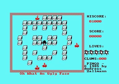 Kalte Füße, heiße Ohren Jeder kennt es, das altbekannte Spielhallenspiel. Trotzdem macht es immer wieder Spaß. Machen Sie mit und schützen Sie unseren Pingo vor seinen Feinden. Bei Pingo handelt es sich um ein bekanntes Spielhallen-Spiel, bei dem Sie einen Pinguin durch eine Eiswüste bewegen. Mit beweglichen Eisblöcken müssen Sie dabei Ihren Pinguin vor seinen Feinden schützen. Das vollständig in Maschinensprache geschriebene Programm hat 20 verschiedene Levels, die Sie mit dem Pingoeditor (Listing 6) editieren und nach Ihren Wünschen verändern können. Geben Sie zuerst Listing 1 ein. Dieses erstellt ein schönes Titelbild und lädt die anderen Teile nach. Saven Sie es dann mit GOTO 10000 auf Band. Tippen Sie nun Listing 2 ein und starten Sie mit RUN. Der Rechner poked daraufhin das MC-Programm in den Speicher. Taucht ein Fehler auf, so zeigt der Computer die entsprechende Stelle an, die Sie nun verbessern müssen. Anschließend können Sie wieder mit RUN starten. Ist alles in Ordnung, wird das MC-Programm abgesaved.